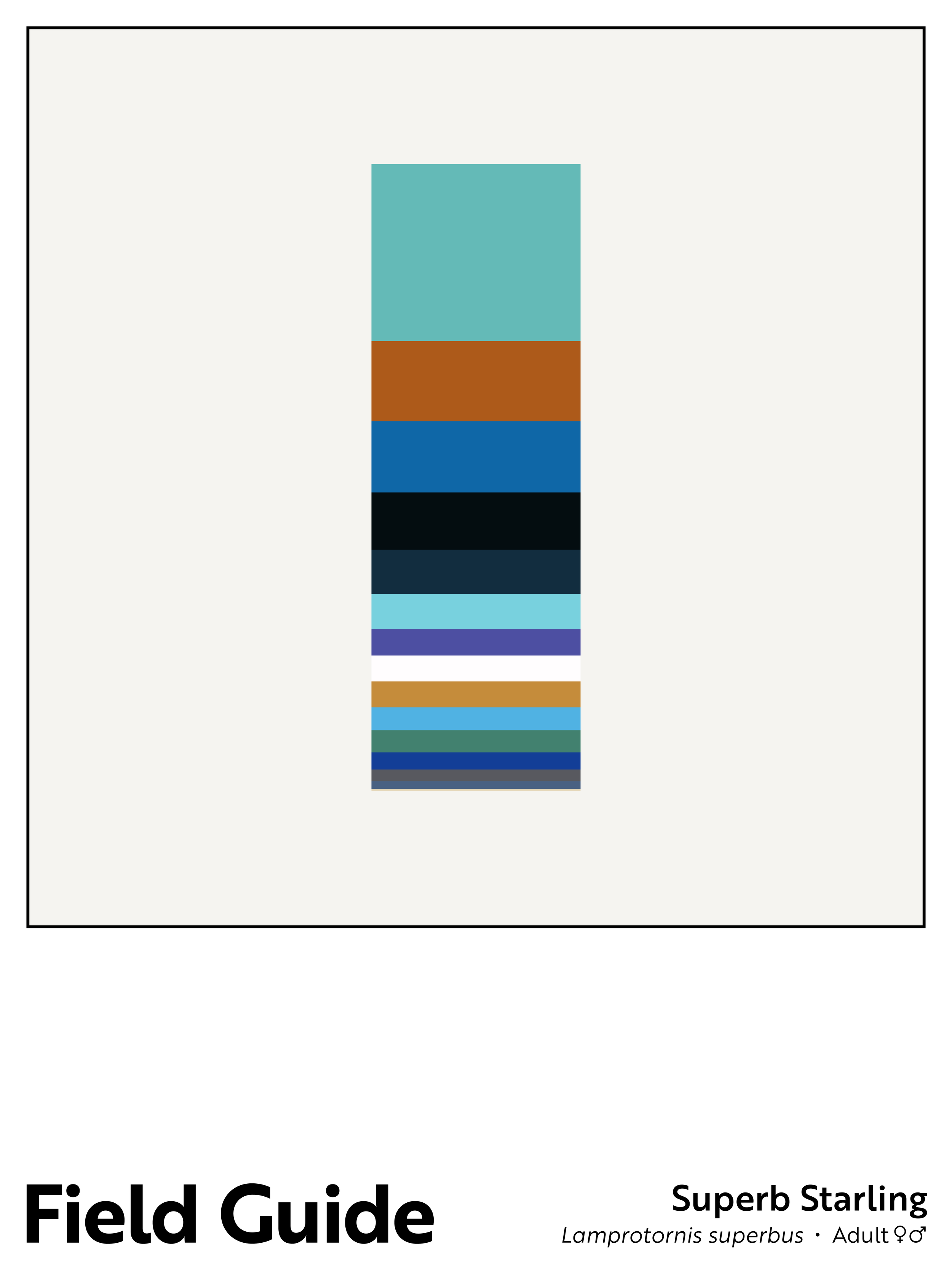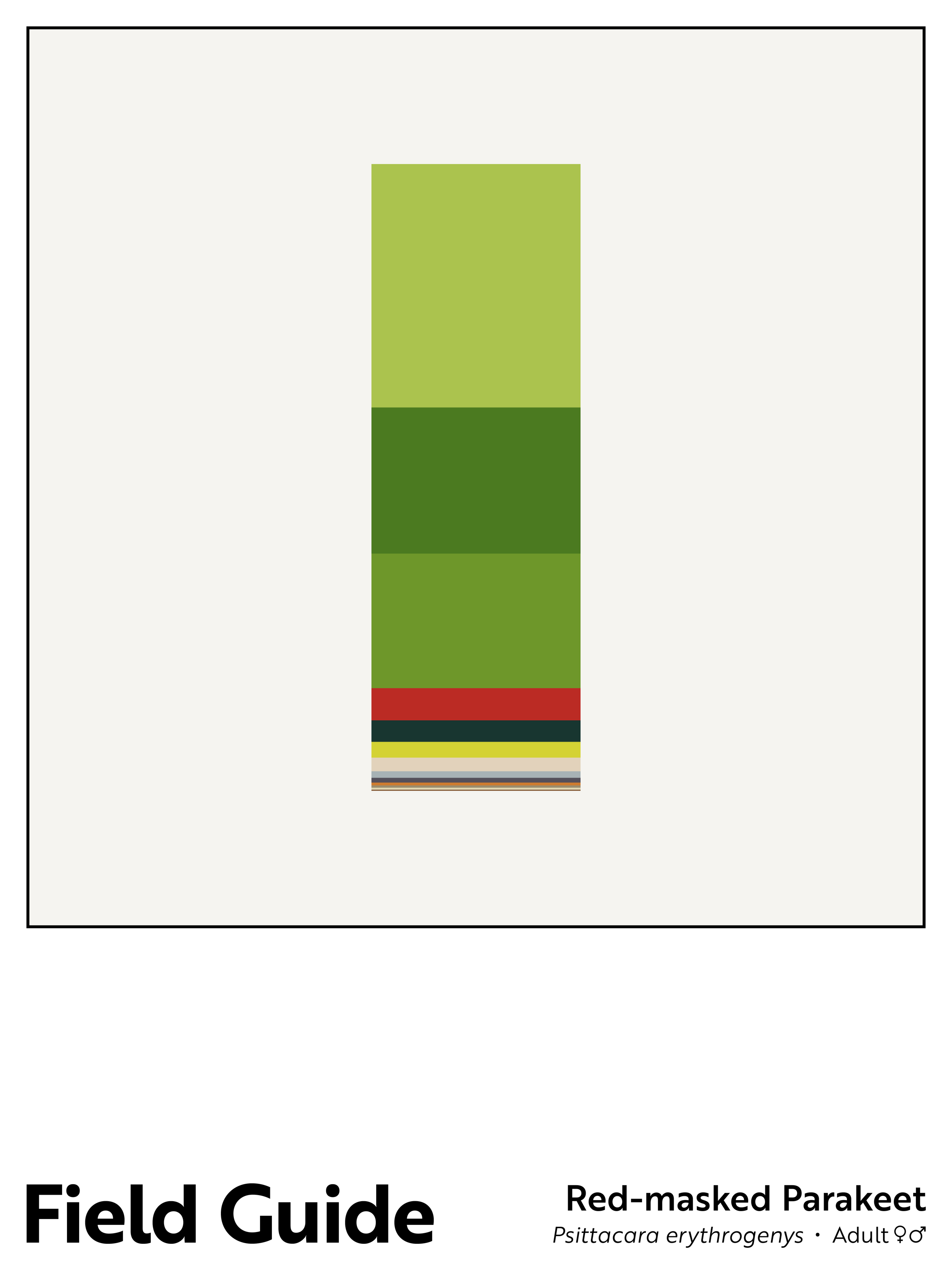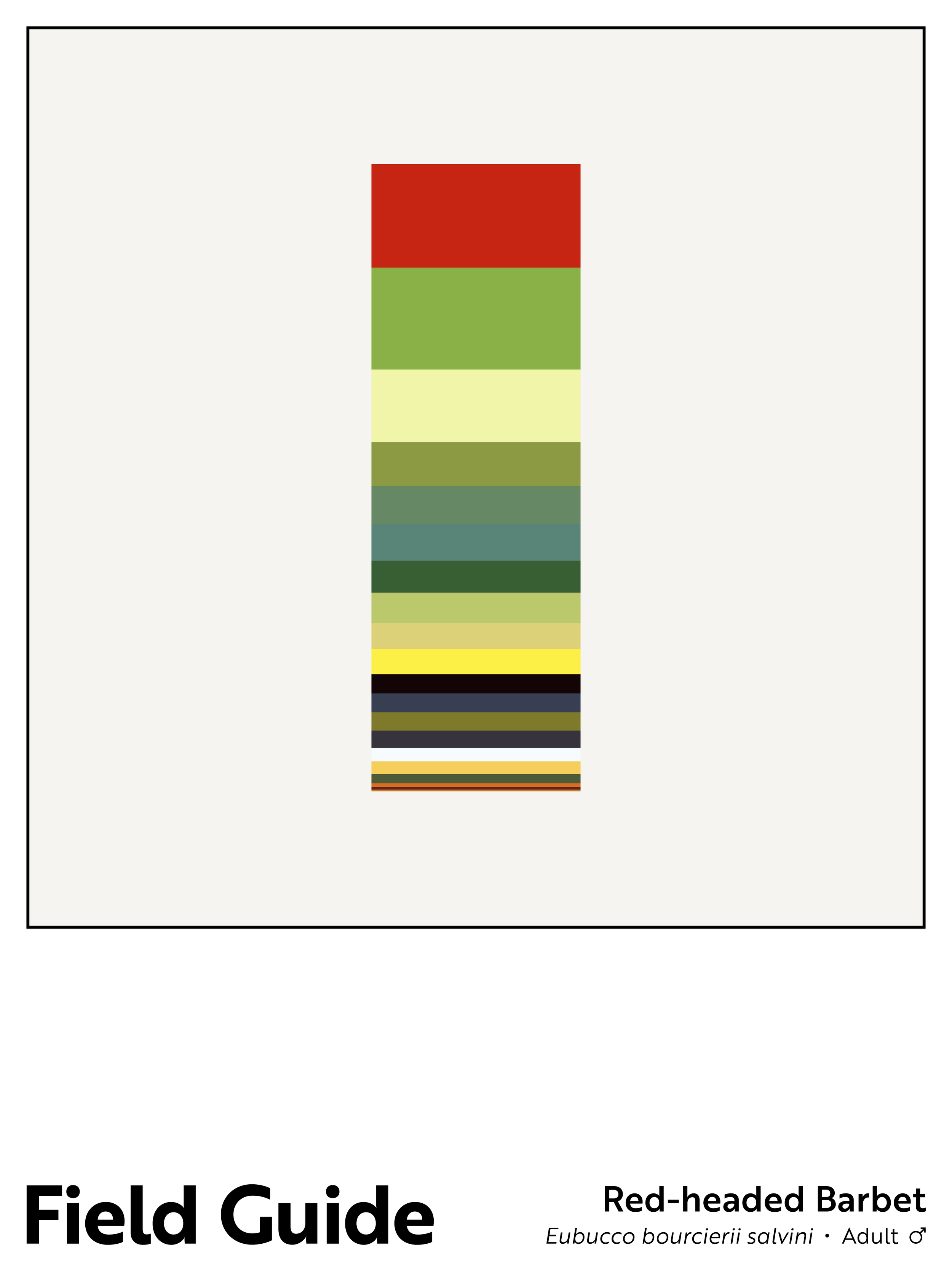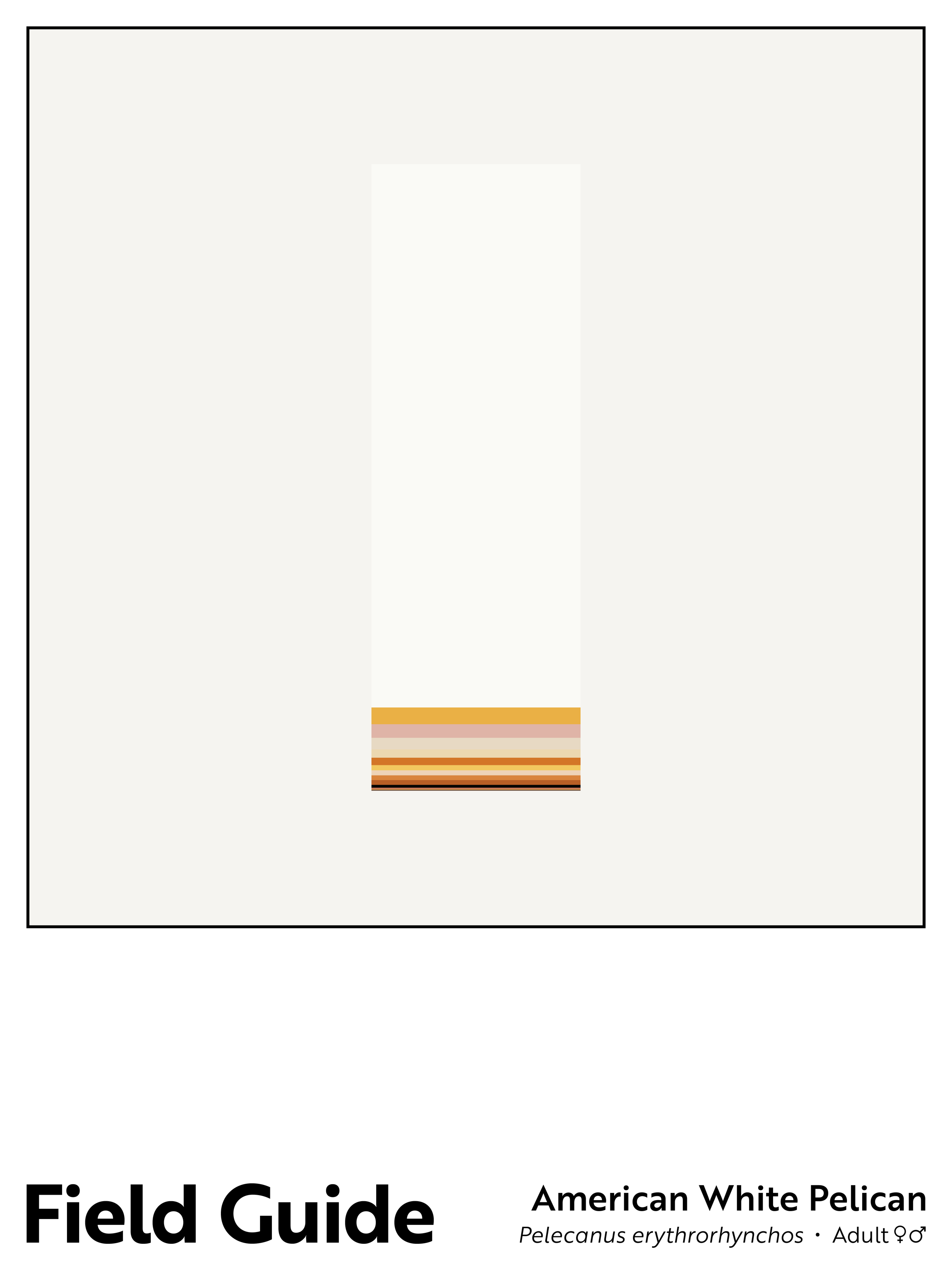 For the Field Guide project, I consider birds from one angle – literally, birds viewed in profile. I then breakdown each bird by color (plumage, legs, beaks/bills, and eyes) and create the column shown in the center of each poster. The colors in each column are stacked according to the percentage of a given color observed, with the largest share at the column’s top and the smallest share at the column’s base. The bird’s English common name and its scientific binomial are noted on the poster’s base, along with information on the bird’s sex, and, if relevant, plumage variation.
